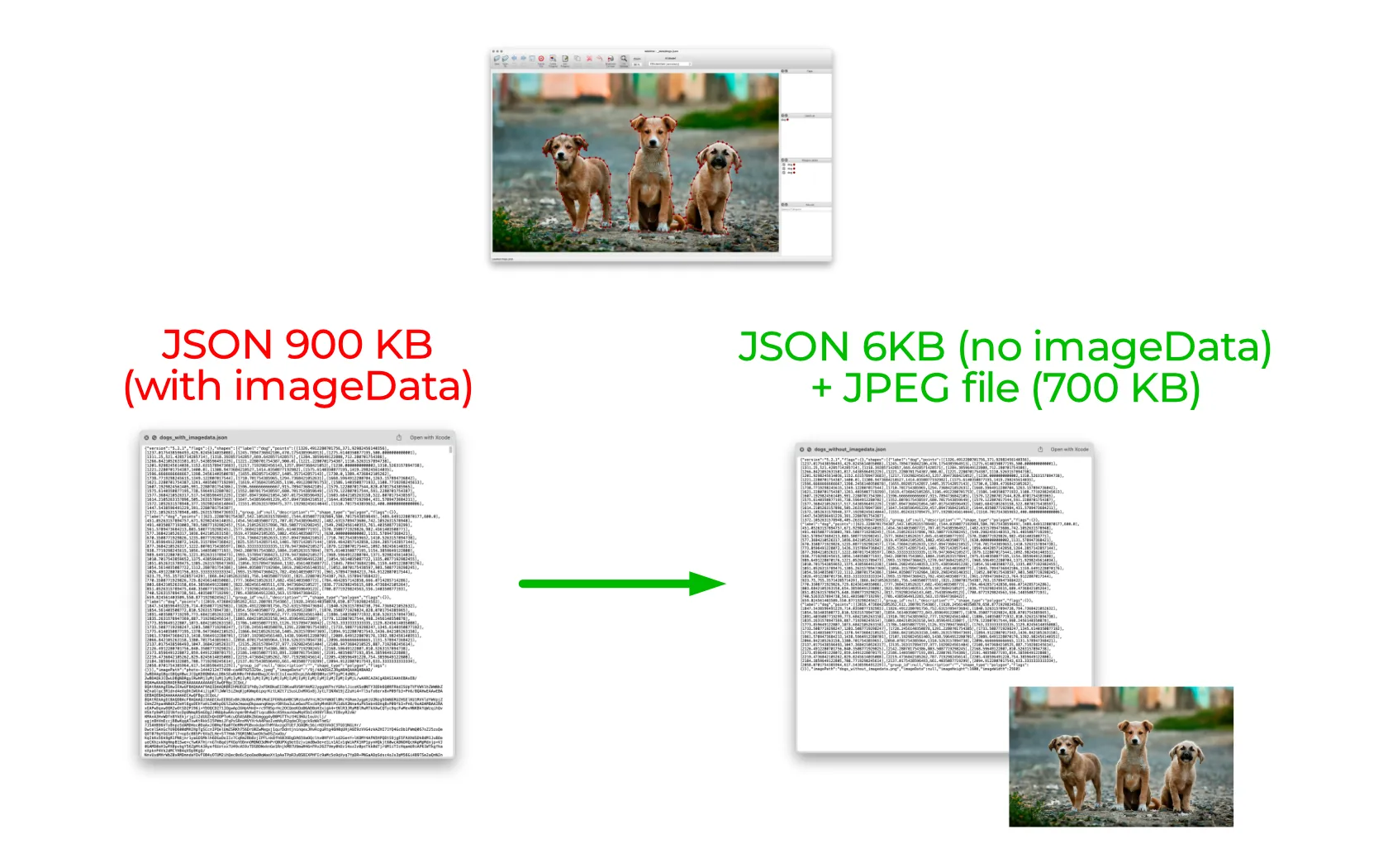 However, when you want to keep the original image file (like JPEG/PNG format), you will have duplicate image data stored both in the JSON and the image file. This wastes your storage.